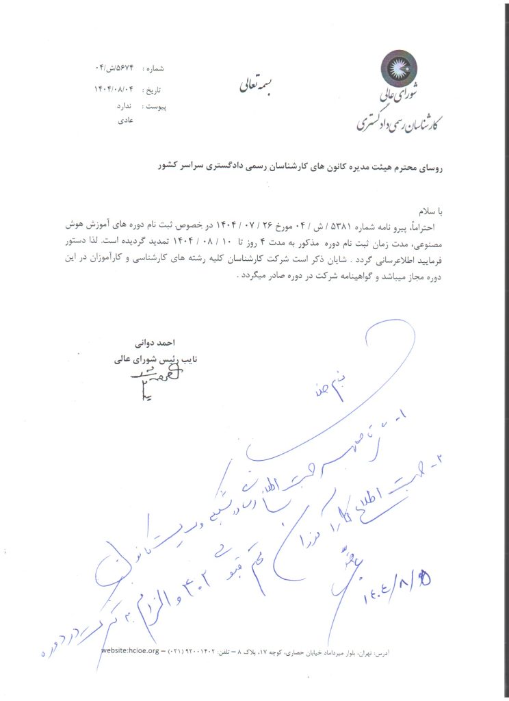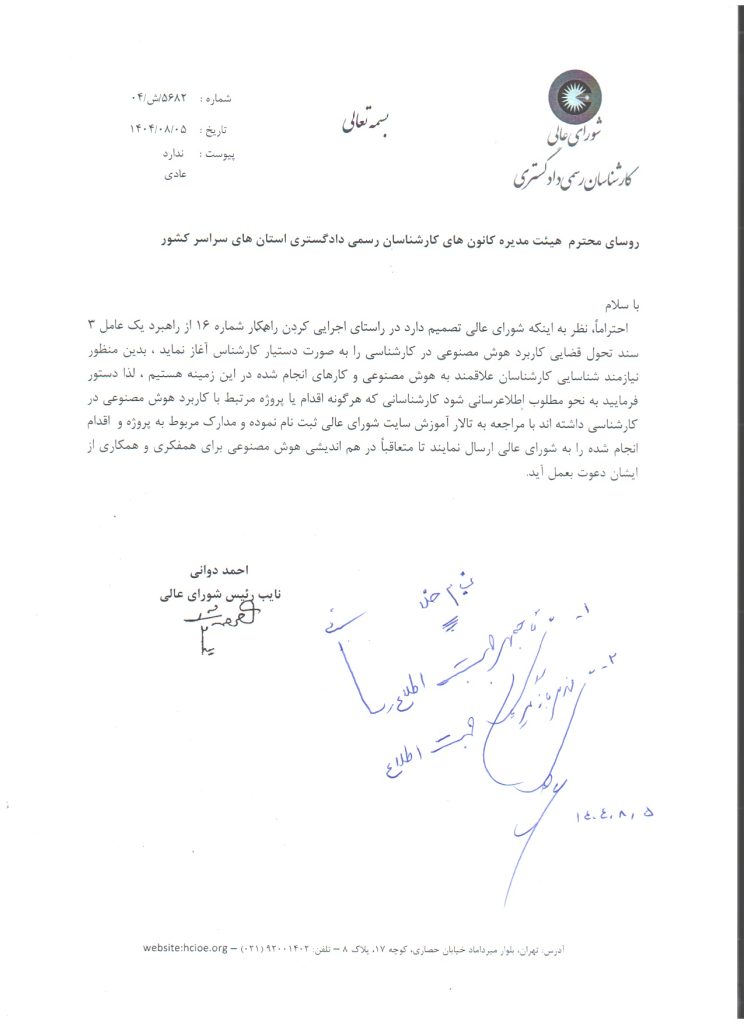 کارشناسانی که هر گونه اقدام یا پروژه مرتبط با کاربرد هوش مصنوعی در کارشناسی داشتهاند، با مراجعه به تالار آموزش سایت شورای عالی ثبتنام نموده و مدارک مربوط به پروژه و اقدام انجام شده ره به شورای عالی ارسال نمایند