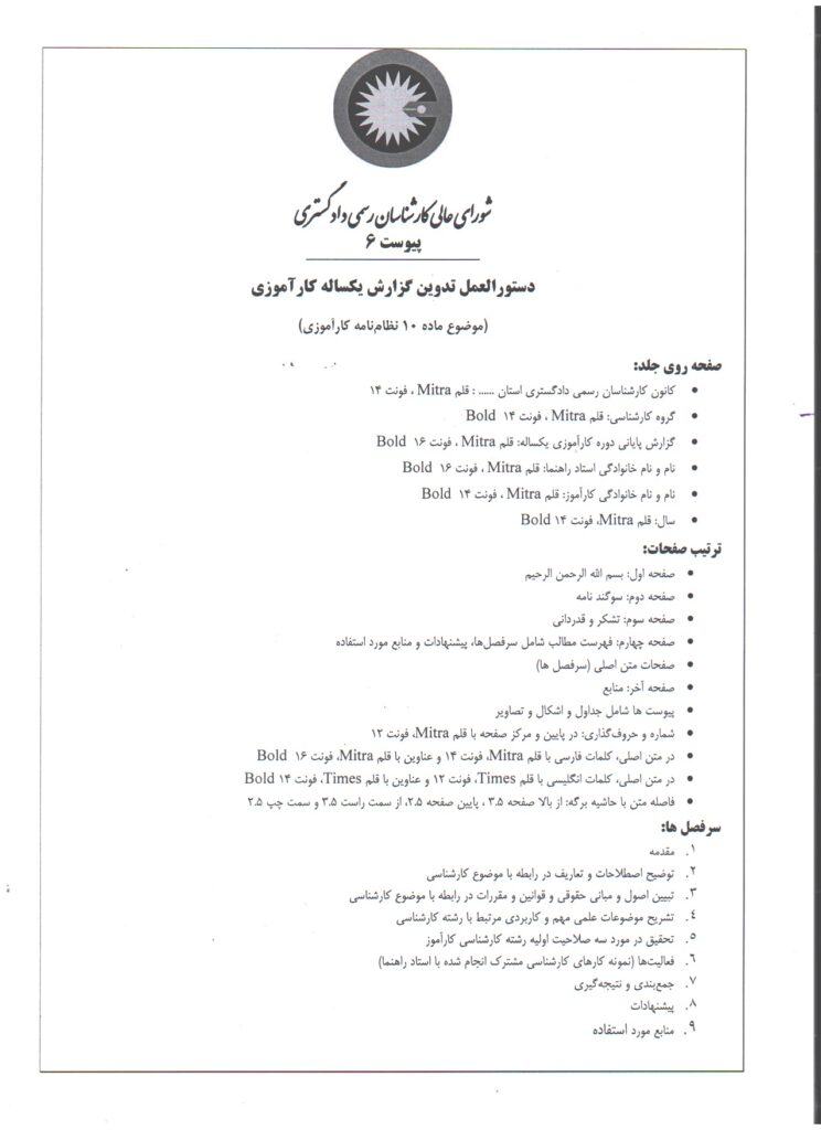 لطفا پس از اتمام دوره کارآموزی یک ساله، گزارش پایان دوره به شرح پیوست، تهیه و پس از مطالعه و تایید توسط استاد راهنما به صورت صحافی شده به امور کارشناسان تحویل نمایید