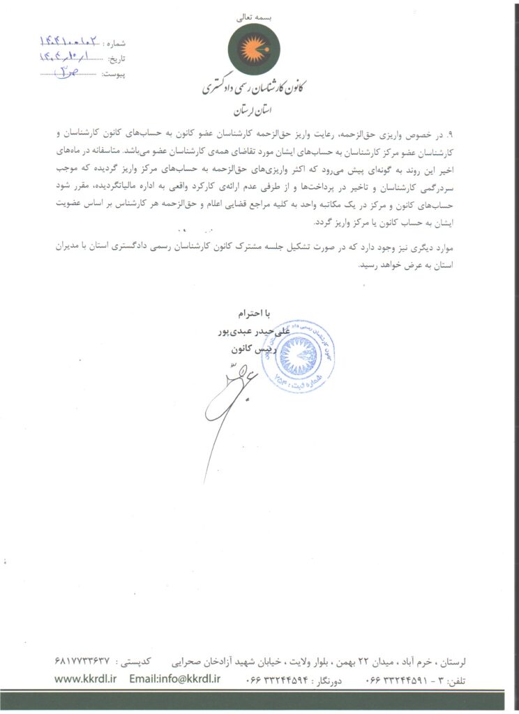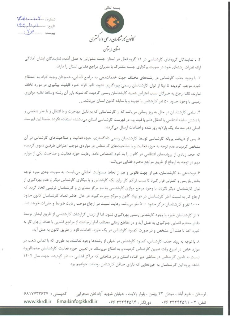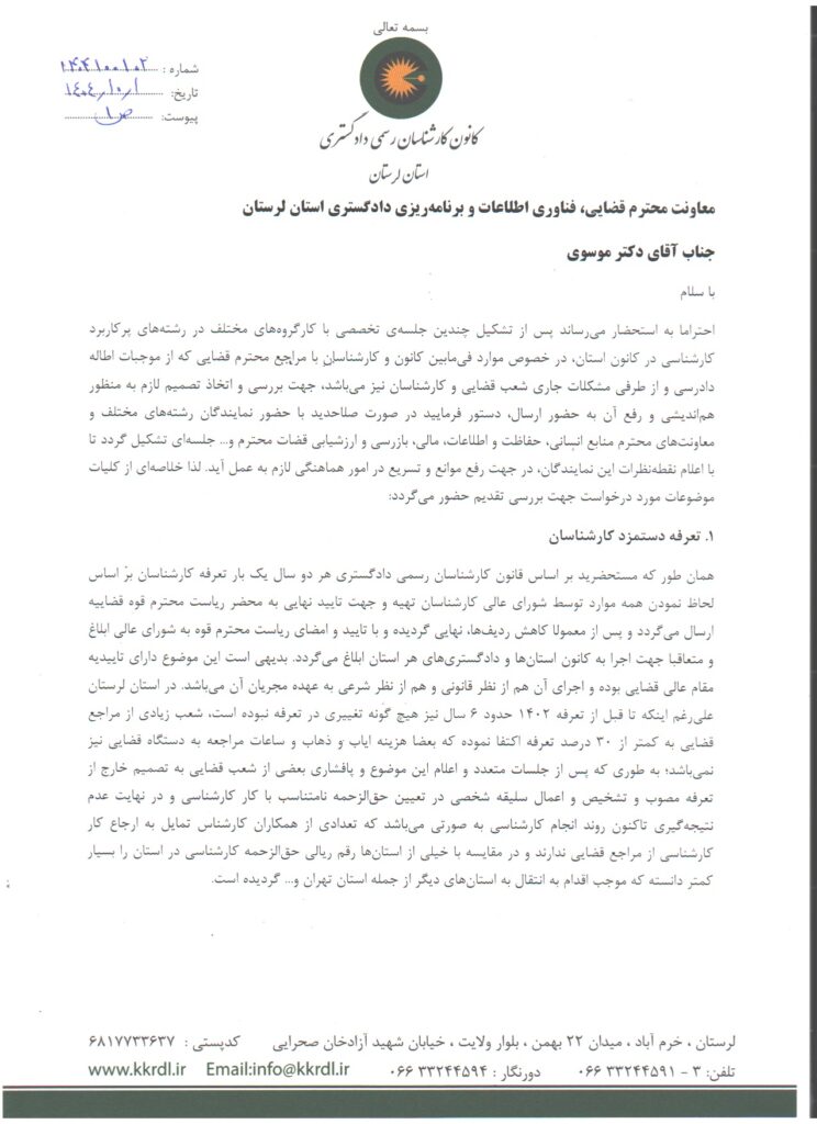 نامه ریاست کانون به معاونت قضایی، فناوری اطلاعات و برنامهریزی دادگستری استان لرستان در خصوص چالشها و مشکلات حوزه کارشناسی